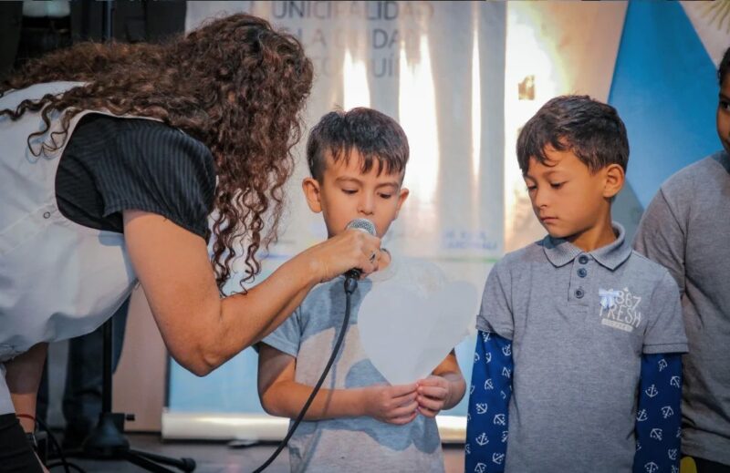 Por la mañana del 2 de abril, se llevó a cabo el acto oficial protocolar con la participación de estudiantes, escoltas, abanderados, autoridades, representantes de bomberos, fuerzas militares, instituciones intermedias y vecinos. En un gesto cargado de ternura y respeto, niños y niñas de la escuela Edelmiro Maidana entregaron frases escritas por ellos a veteranos y enfermeras navales.