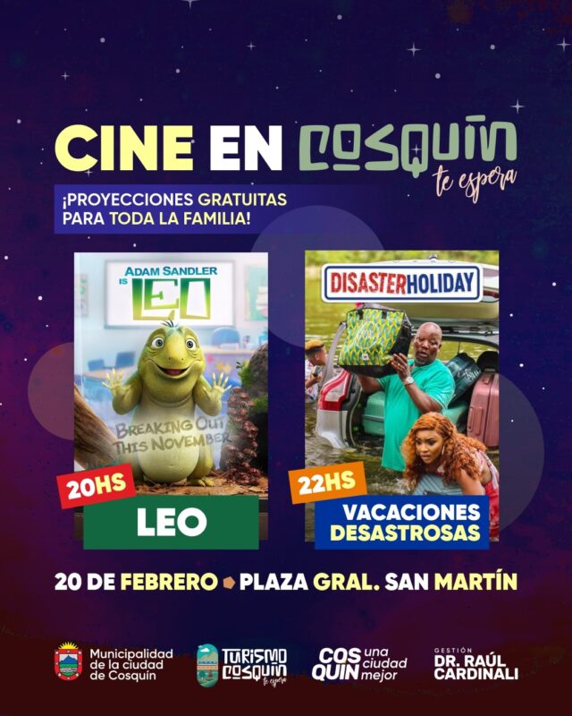 - El viernes 20 de febrero, desde las 20 hs en Plaza Gral. San Martín, se realizará una jornada de cine al aire libre con proyecciones para toda la familia y pochoclos gratuitos para los más pequeños.