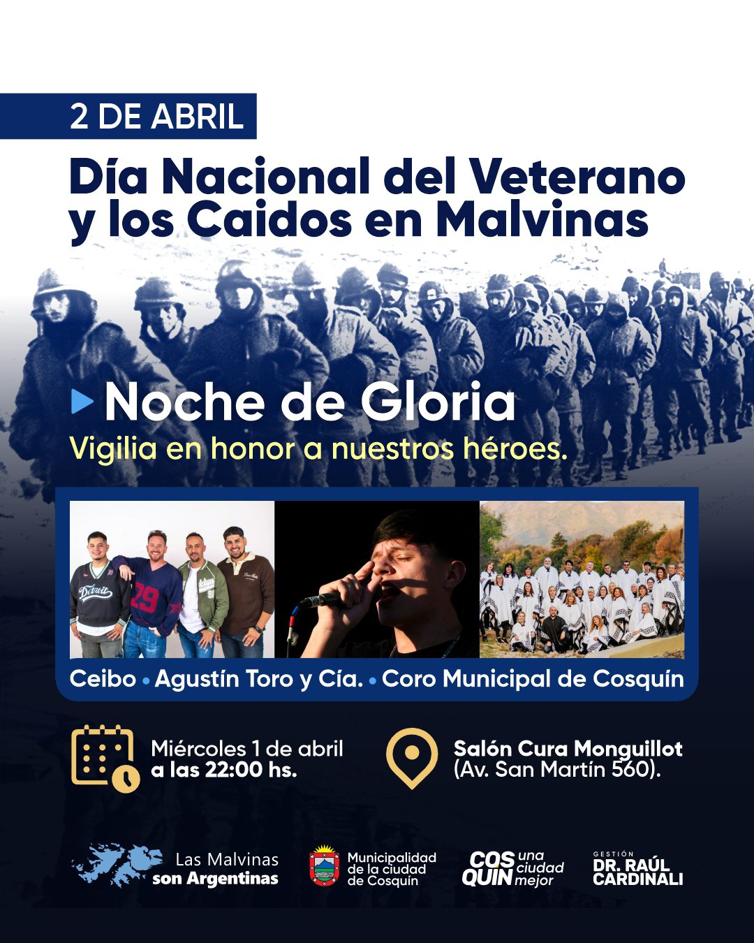 Desde las 22hs del miércoles se llevará a cabo la Noche de Gloria “Vigilia en honor a nuestros héroes” en el salón Cura Monguillot, una noche de encuentro, memoria y homenaje con música en vivo de Ceibo, Agustín Toro y el Coro Municipal.