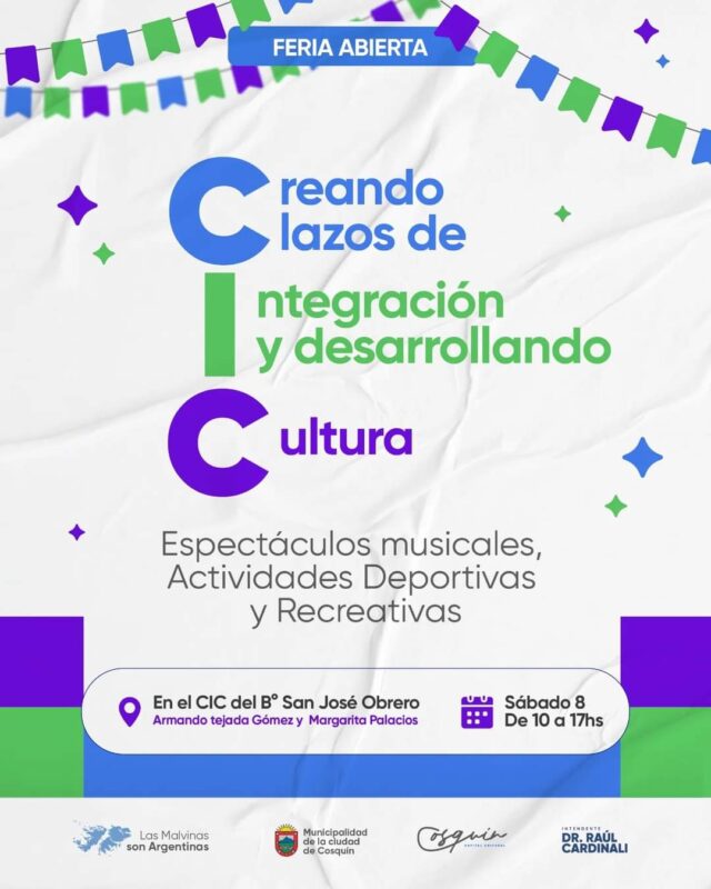 El próximo sábado 8 de junio desde las 10hs y hasta las 17hs en el C.I.C de Barrio san José Obrero se llevara a cabo una Feria Abierta con el lema ¨Creando lazos de Integración y desarrollando Cultura¨