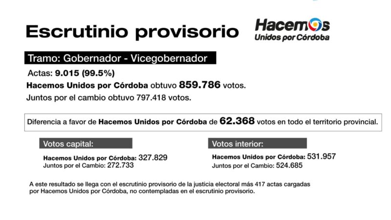 La coalición dio a conocer un escrutinio provisorio que alcanza al 99.5 por ciento del total de votos. Son exactamente los mismos datos con los que cuentan todas las fuerzas que participaron de la elección.